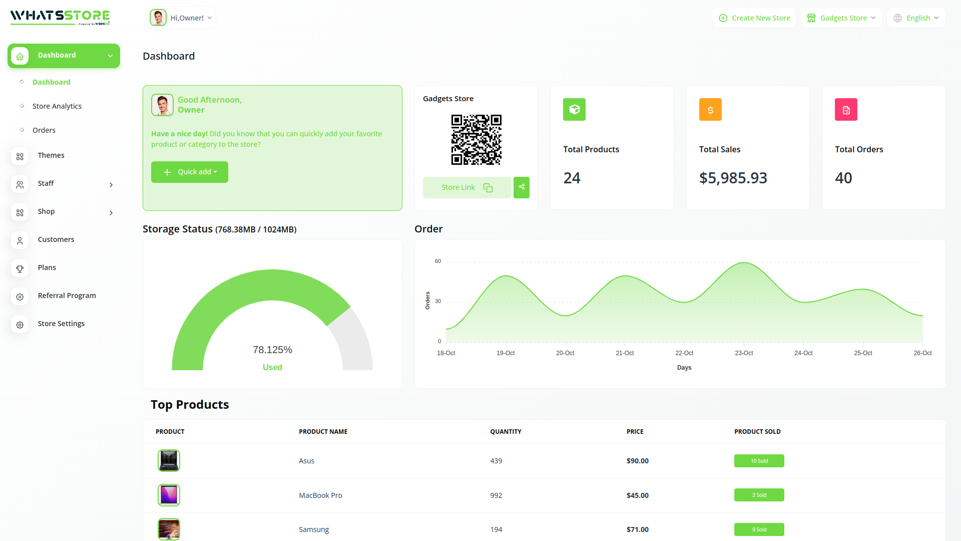 Create and manage your online WhatsApp store faster and easier than ever with WhatsStore SaaS. Build your store in minutes! Control inventory and prices, distribute your products, and manage data - All under one tab!